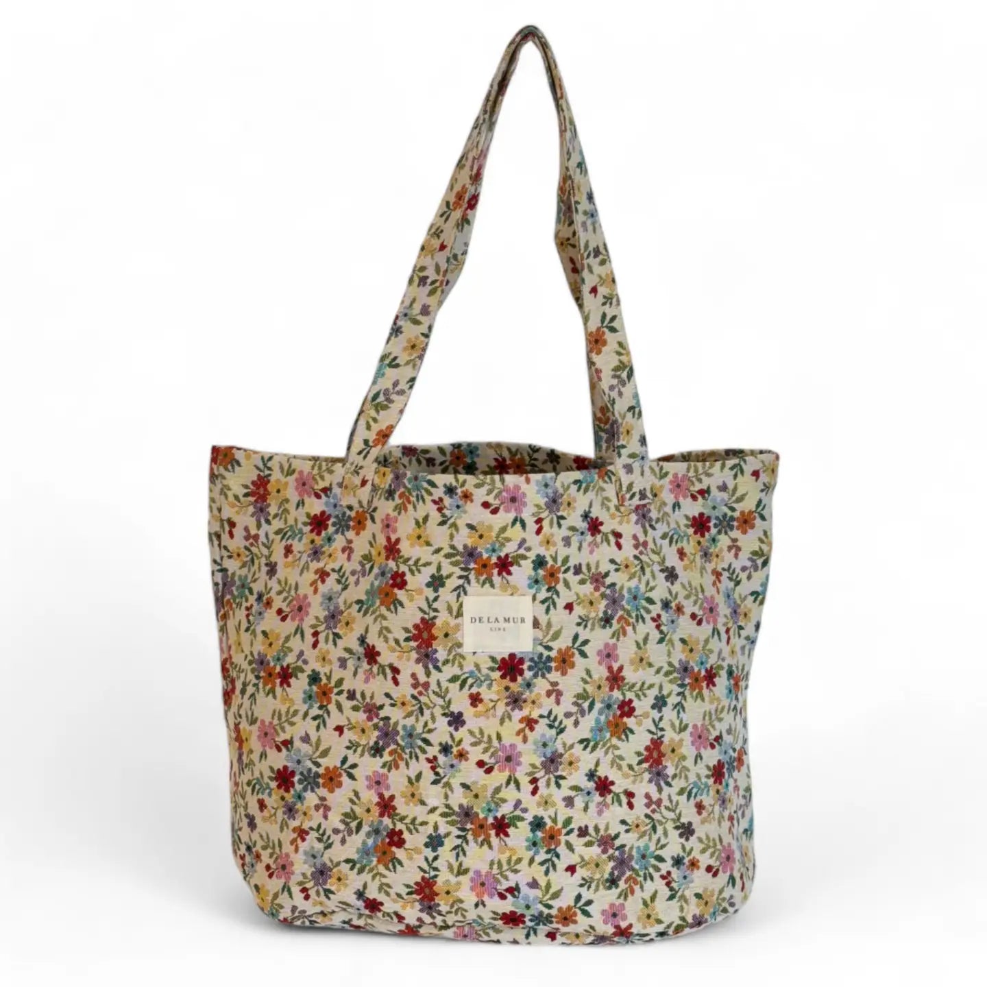 Large shopper bag with shoulder straps. Made from thick jacquard fabric with a floral pattern on a beige background. For proper care, hand wash in cold water and avoid using a tumble dryer. Perfect for shopping, the beach, or work—this versatile bag is great for everything. It offers plenty of space and can hold a lot.