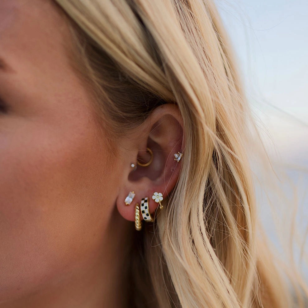 The Black & White Checkered Hoops are made of high quality gold fill and are hypoallergenic and good for sensitive ears. They have a huggie closure style and are the cutest new jewelry trend!