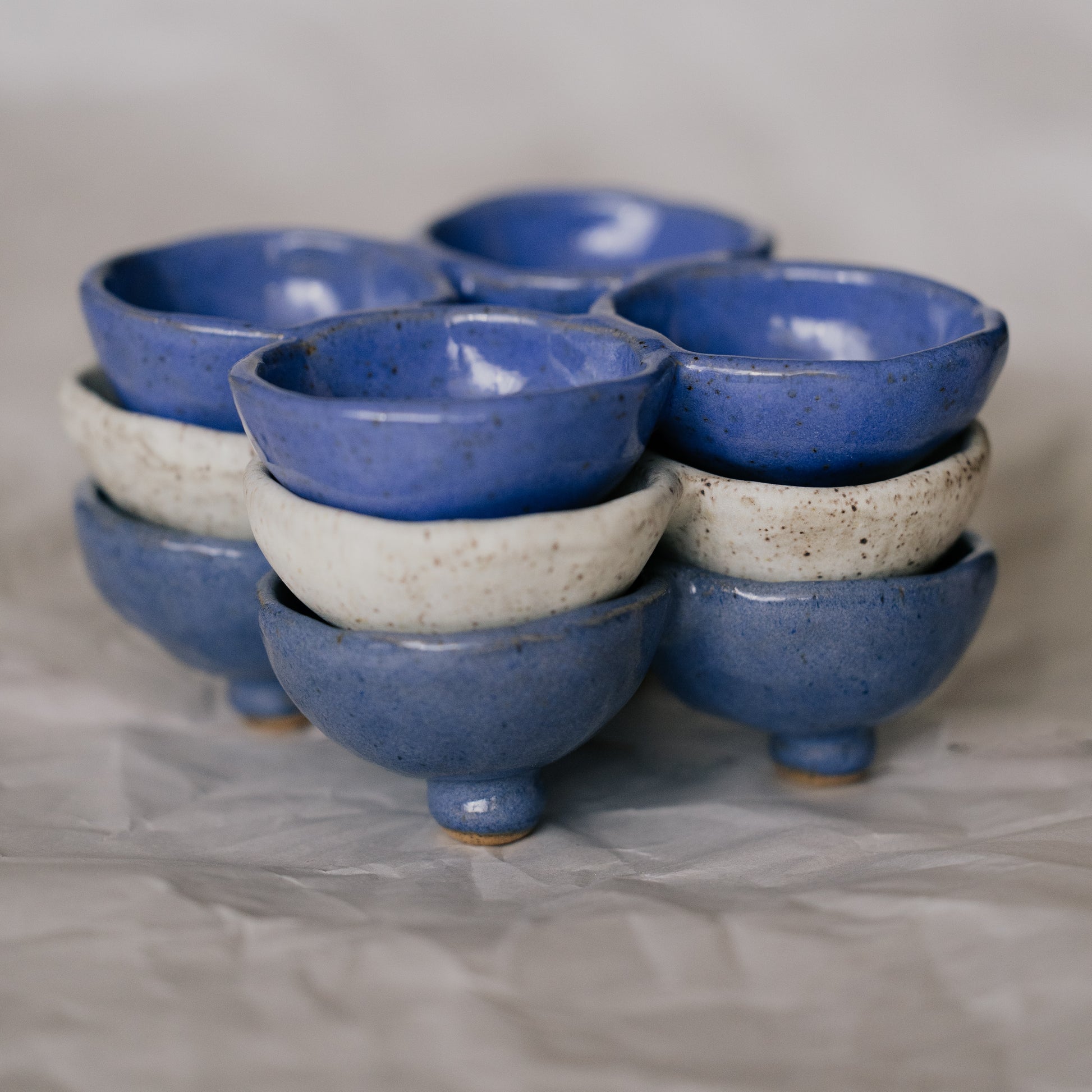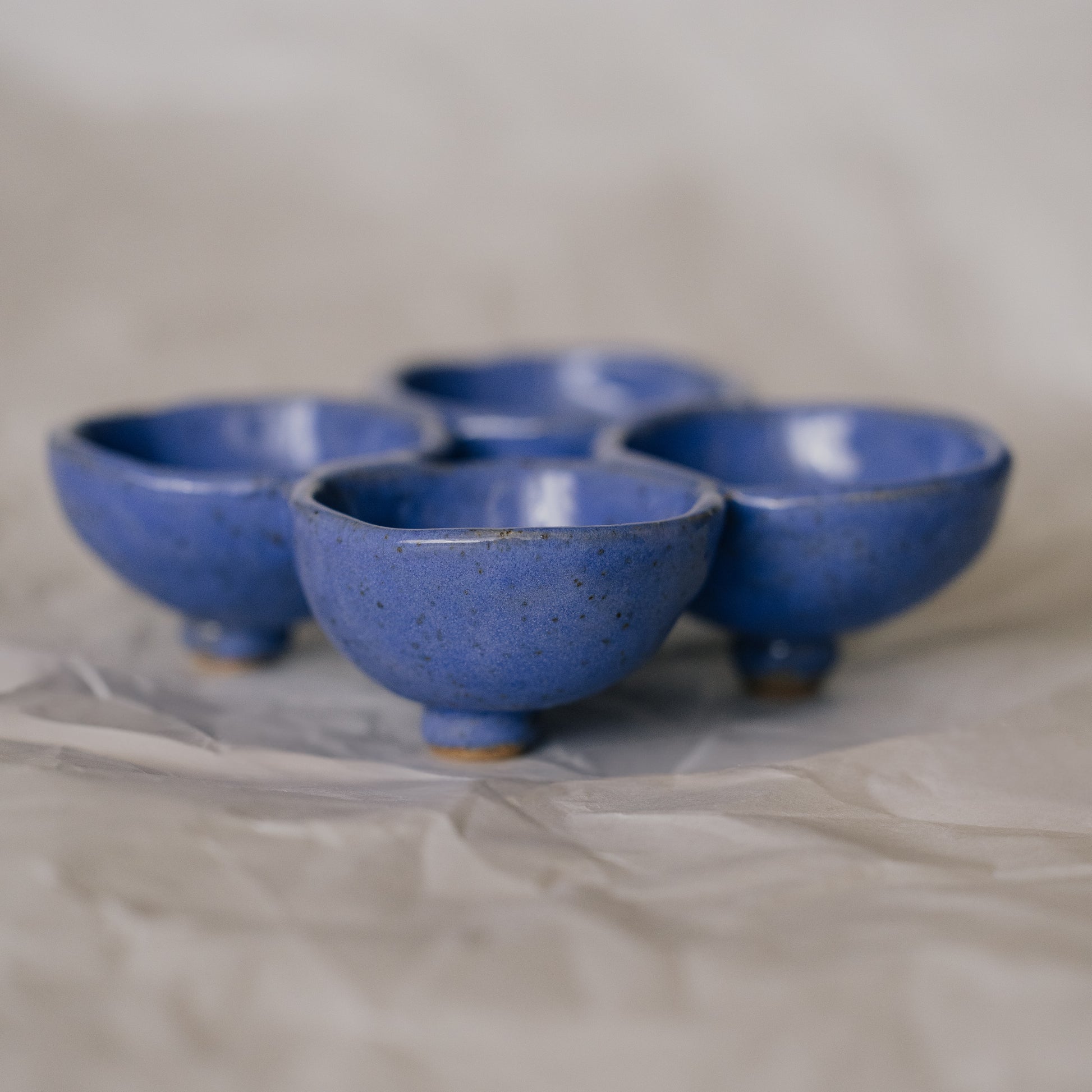 These adorable little pinch pots are joined together to create a charming set of four cluster bowls, complete with playful ball feet that prop them up in style. Made by hand with speckled brown clay and finished in a blue glaze, this piece is both functional and oh-so-cute.