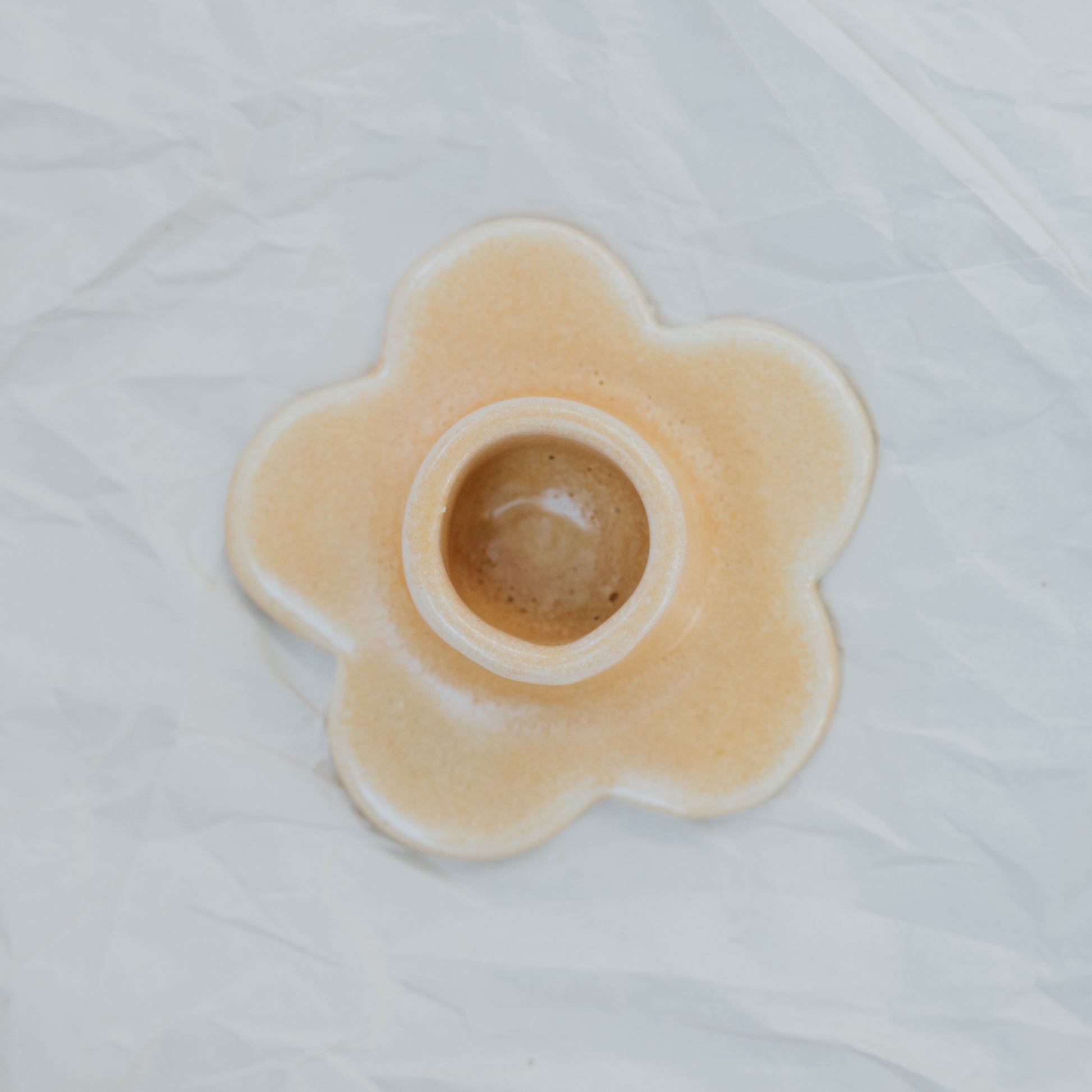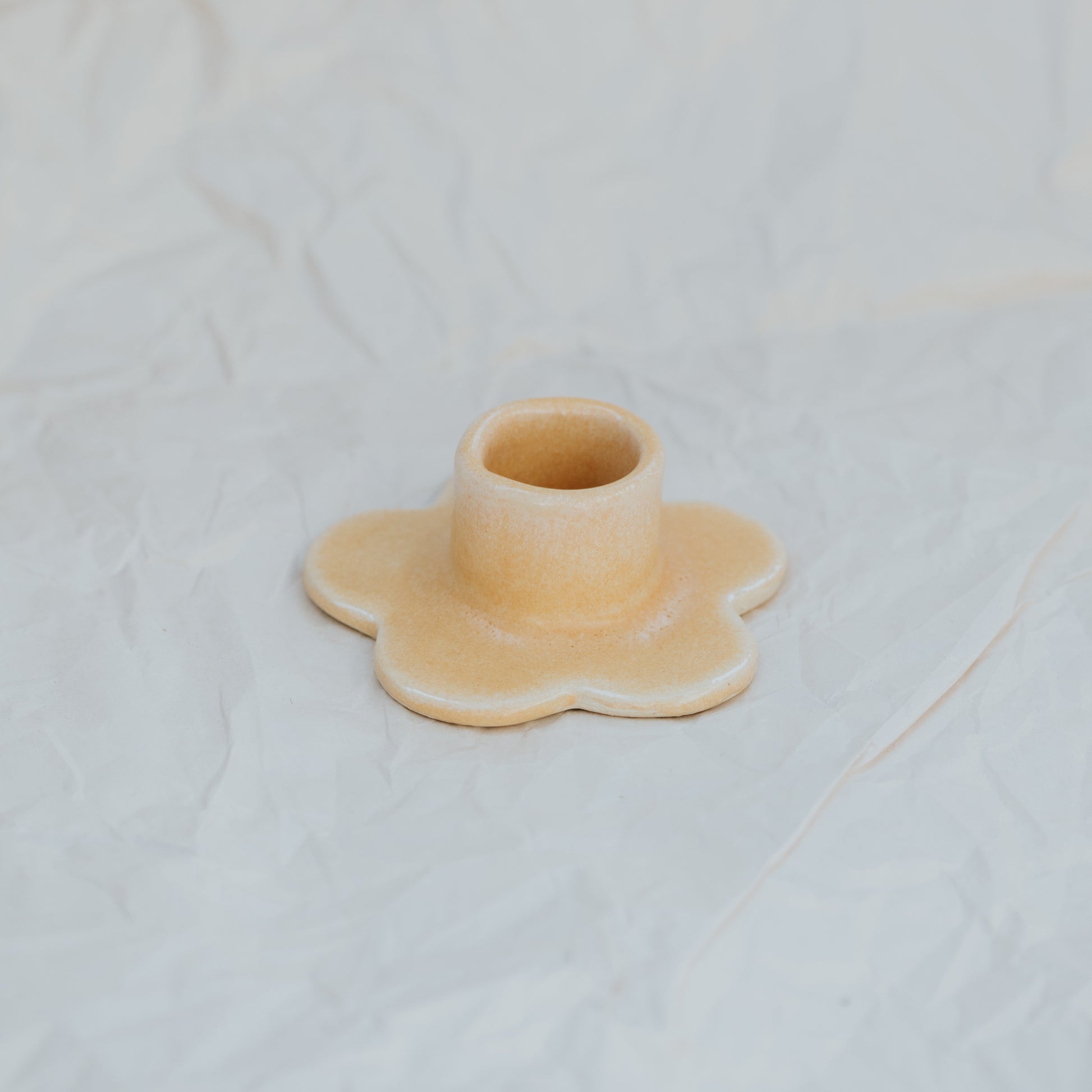 Hand-built and hand-painted ceramic candleholders with a flower base, fully glazed, and stamped on its bottom with rumor logo.