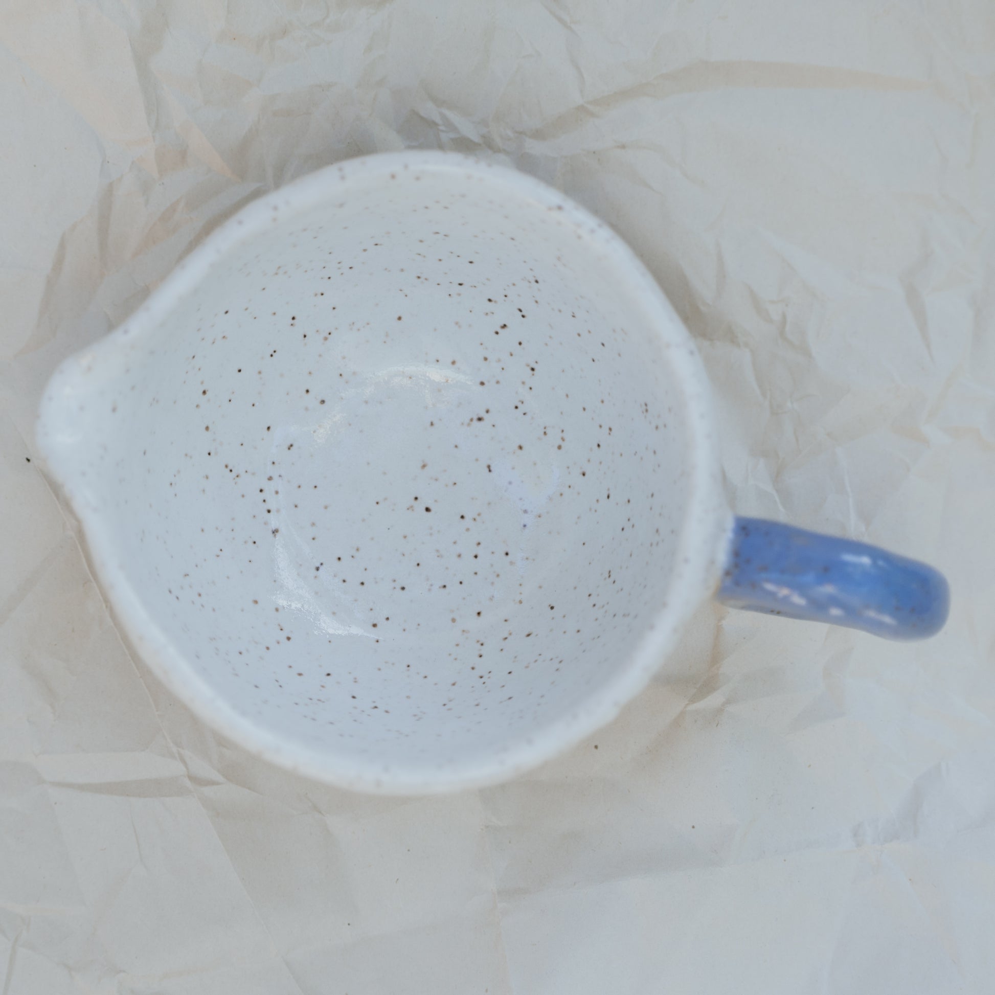 A little floral pitcher with a pop of color on the little circle handle. Formed by hand the pitchers are each going to be slightly different.