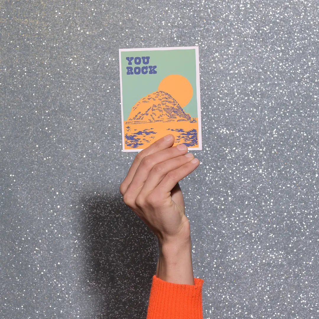 100lb heavyweight card stock. Offset printed. 5.5 x 4.25 inches. Illustrated by eric pfleeger of lonely palm ranch.