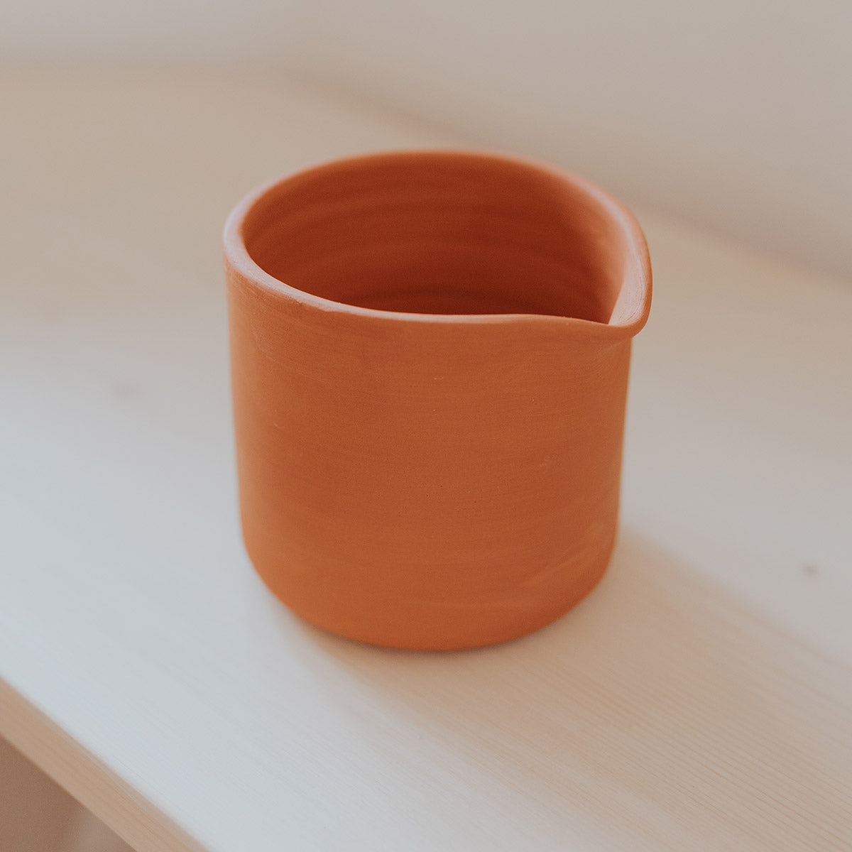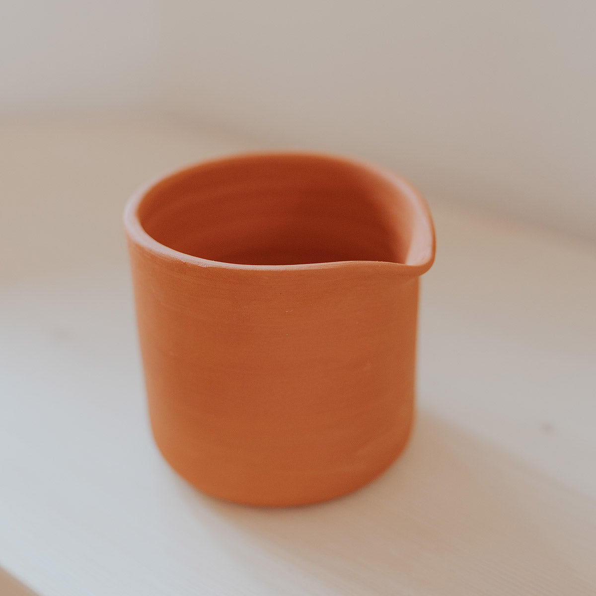 Handmade on the wheel. This adorable pitcher fits perfectly in the palm of your hand. Great for cream, salad dressing or syrups!