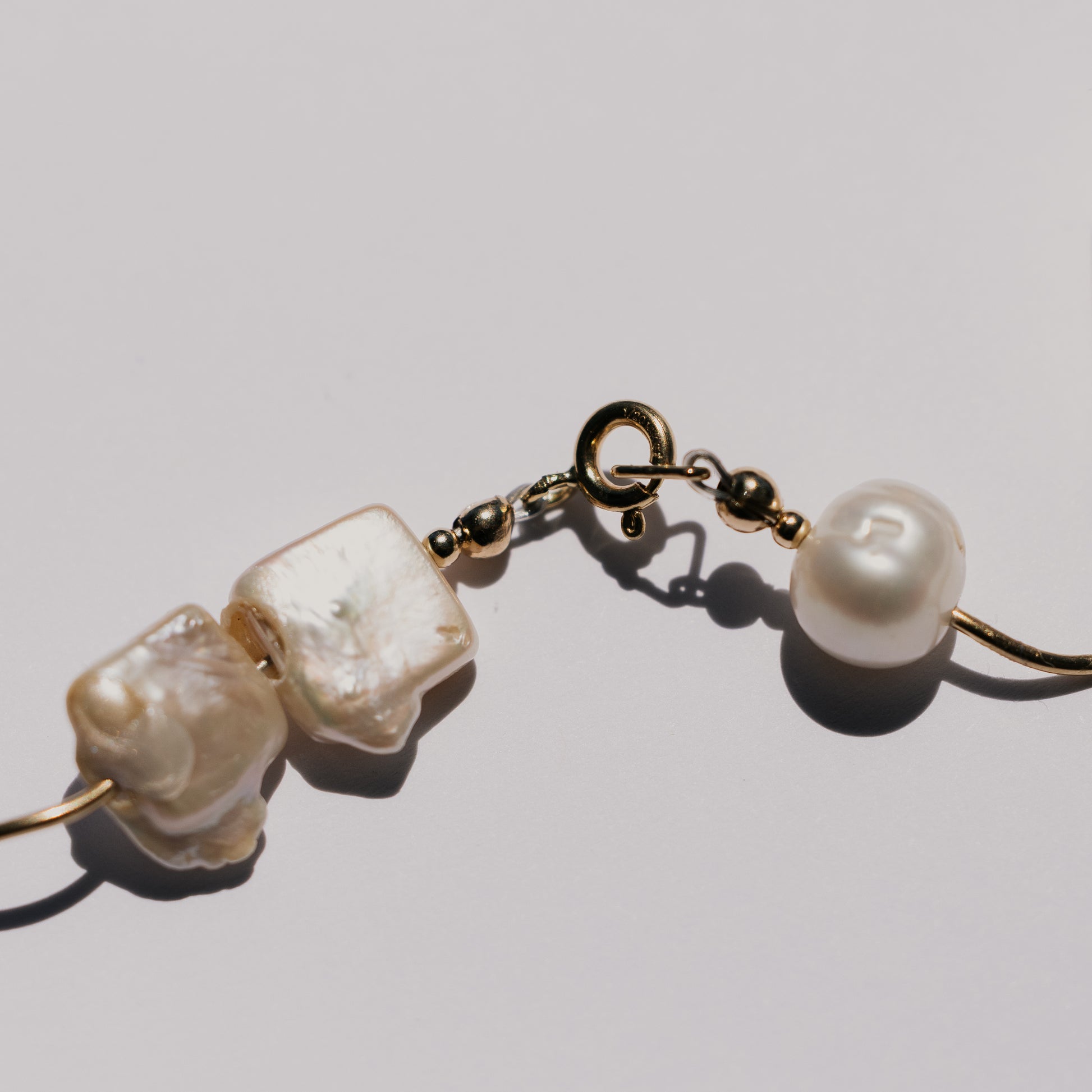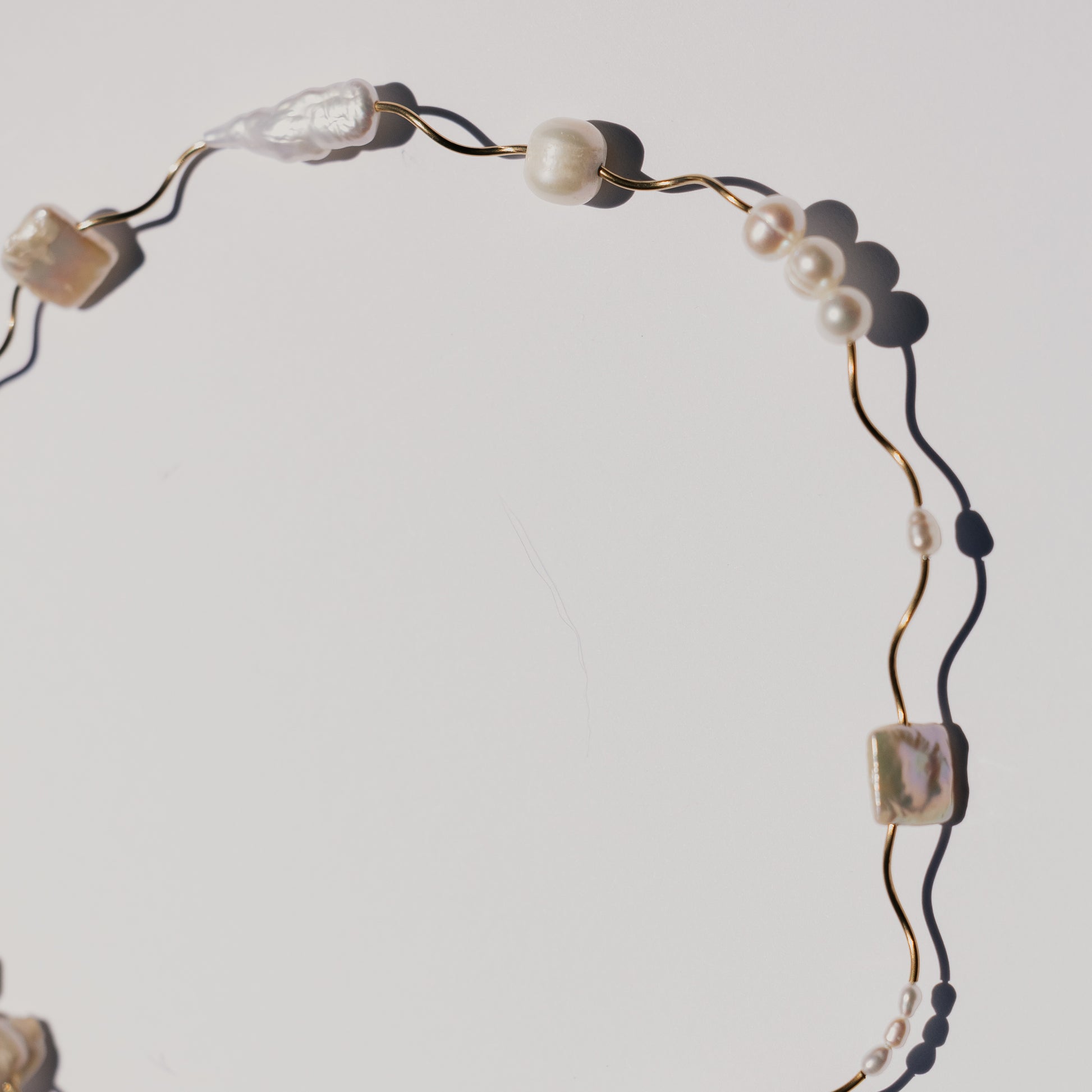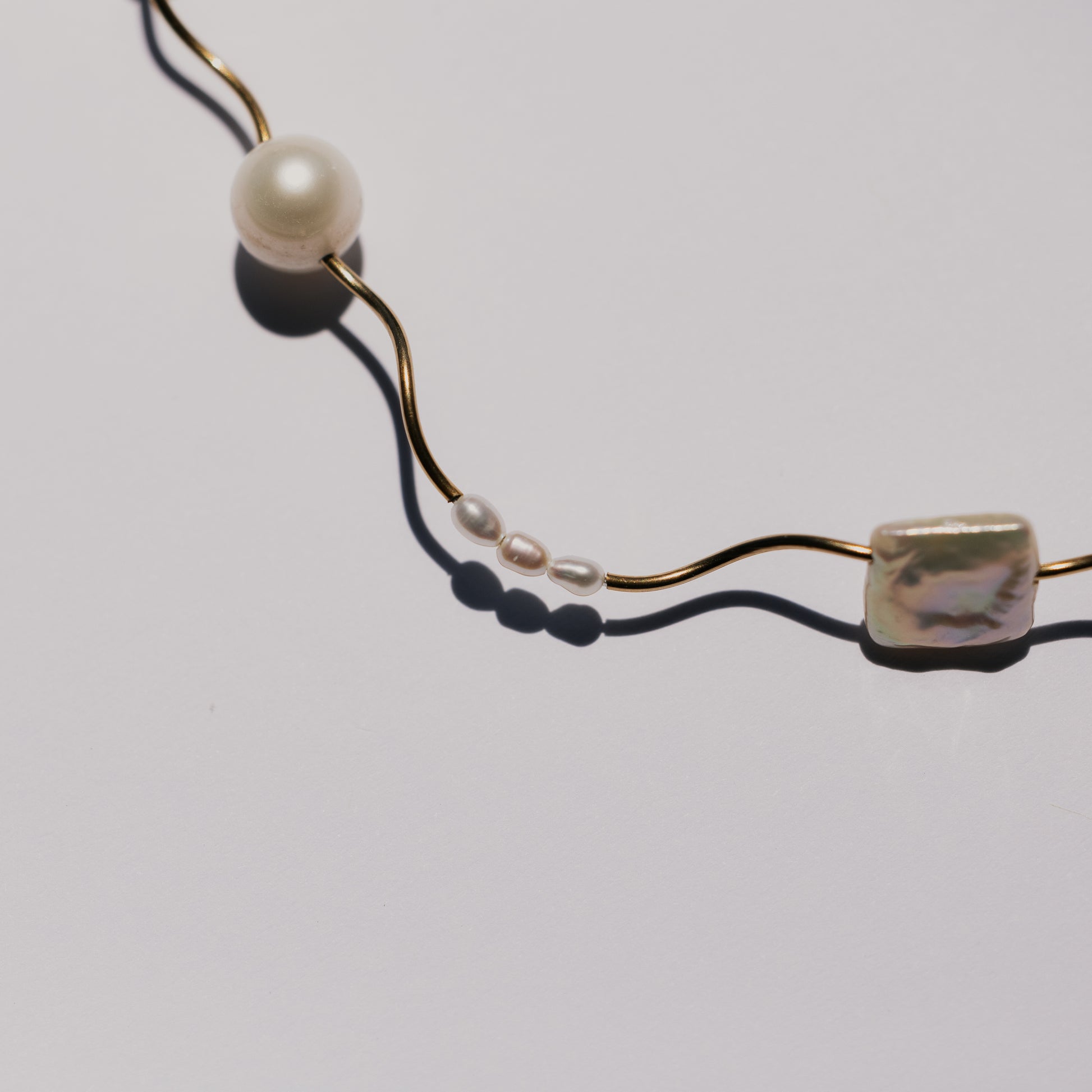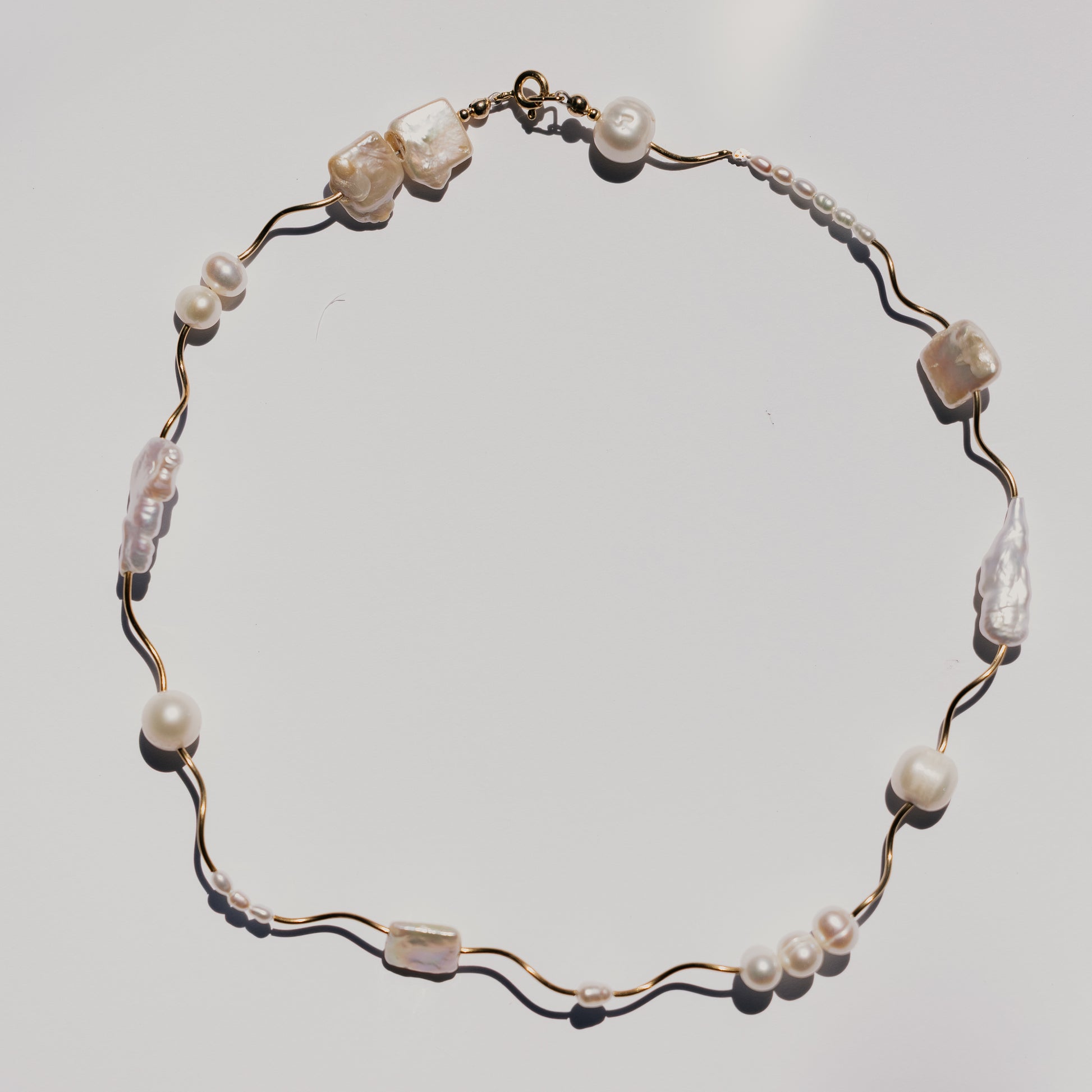 A flowing strand of freshwater pearls, gently spaced by hand-formed curves of gold-filled beads. The Golden Drift Necklace captures the feeling of sunlight on moving water organic, effortless, and quietly luxurious. Each pearl is one of a kind, bringing texture and rhythm to the soft golden line.