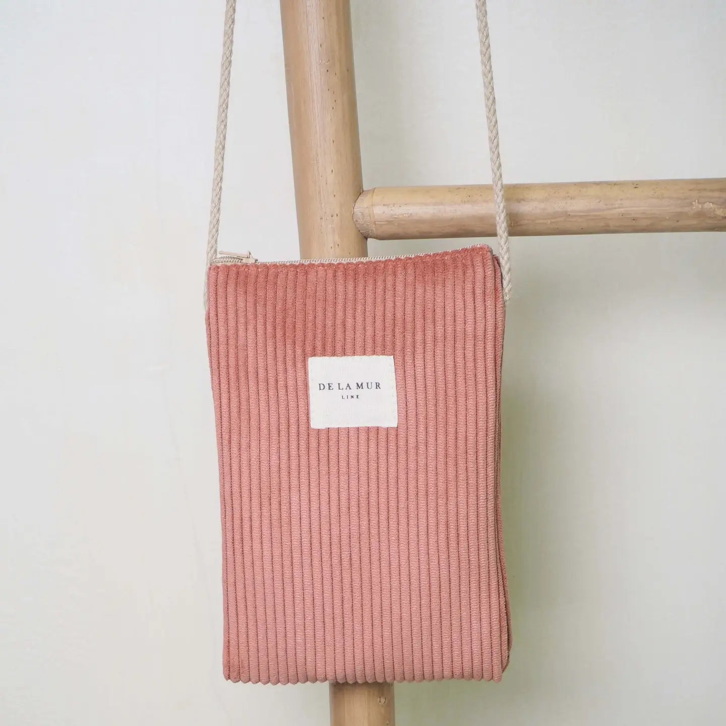 Mobile bag for carrying the shoulder bag type, with a zipper on the top and a long beige cotton drawstring. With thick mustard-colored corduroy fabric. Lined with thick grey fabric on the inside. For proper maintenance, it is advisable to wash it cold by hand and not use a dryer.