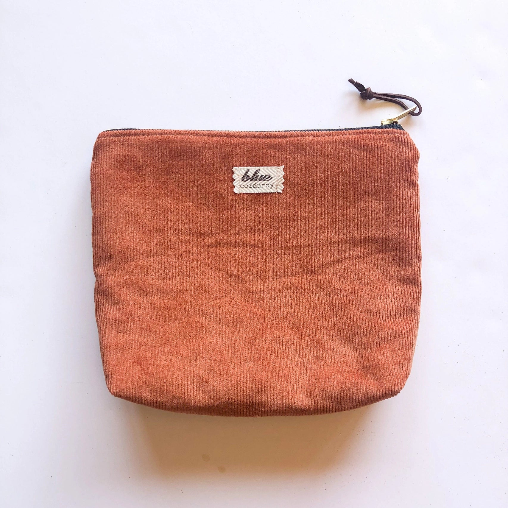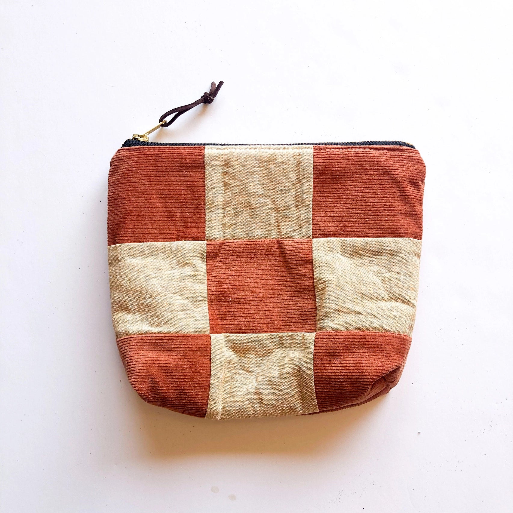 Small checkered bag with zipper closure. This bag is made with a patchwork of mint green linen cotton blend fabric and mustard yellow cotton corduroy fabric on the front and solid mustard yellow cotton corduroy on the back. This bag meaures 10" x 8" and is the perfect size for holding your make up, toiletries, back to school items, and so much more!
