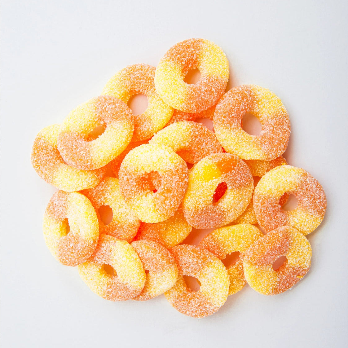 These rings are just peachy! The only truly sour ones in the market. Packed with flavor that will make your taste buds think you just bit into a juicy sour peach.