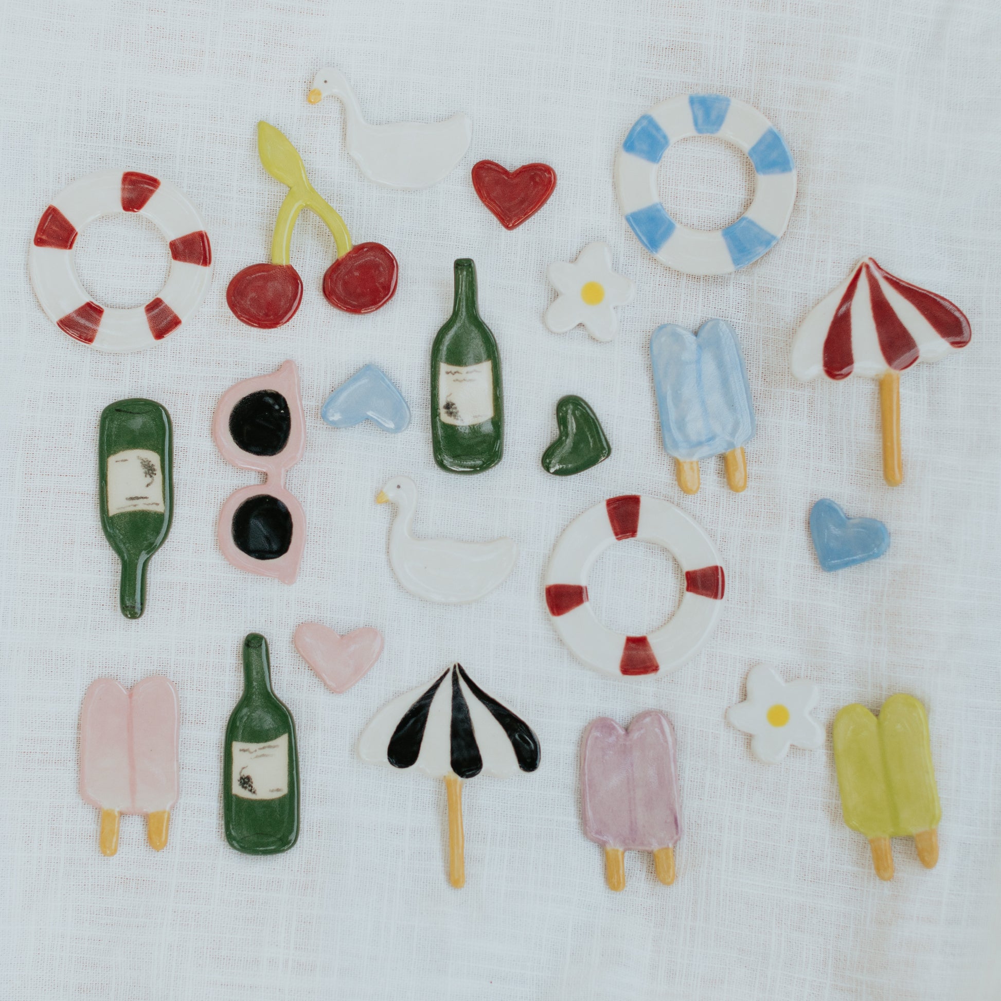 Nothing says summer like these sweet little ceramic magnets. From doodles on paper delicately cut into small clay pieces, hand painted, glazed and fired twice these little magnets have been a labor of love and will brighten your morning!