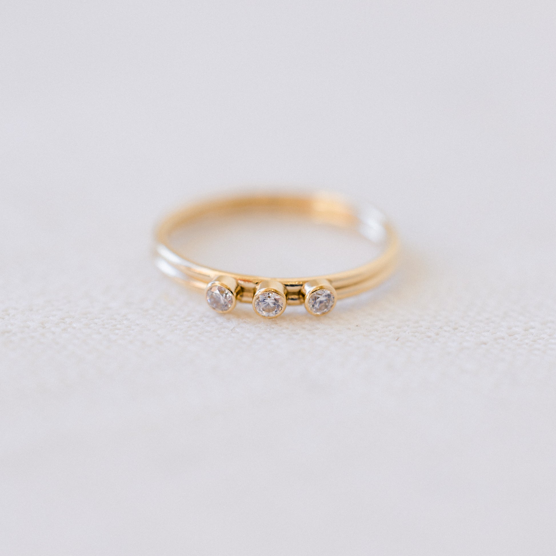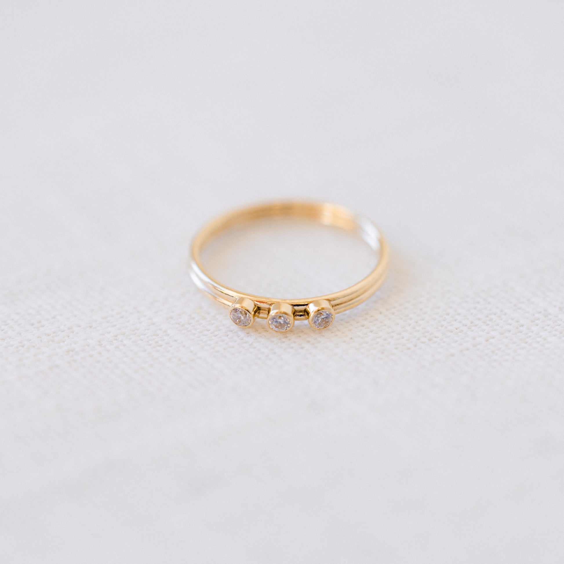 14k Gold filled cz ring with three 2 mm cz stones. double band design.